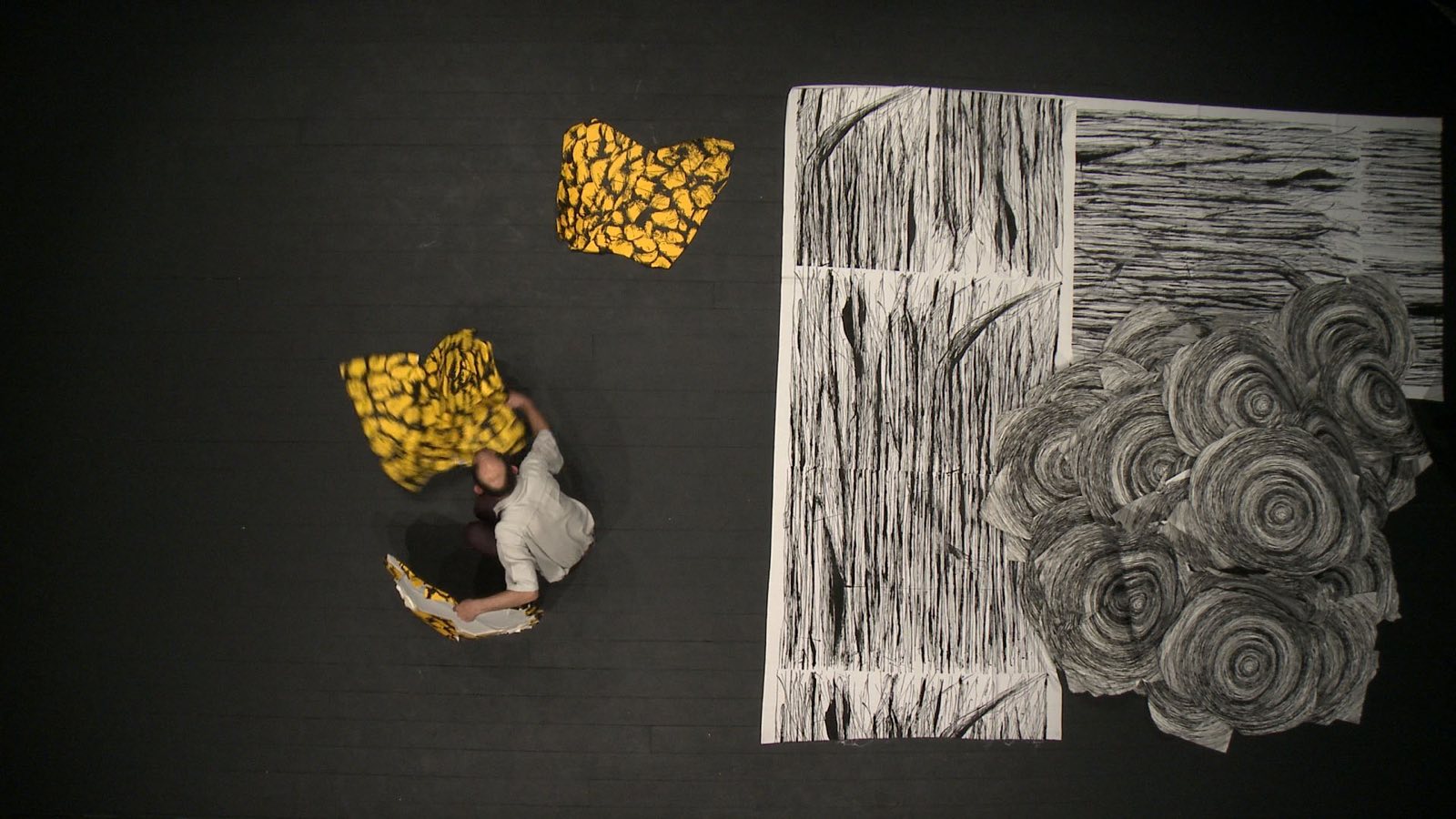 Nous suivons ses gestes, qu’il évide lentement et patiemment les futures zones de blanc de ses gravures, qu’il se jette furieusement sur les linos gravés pour les chiffonner à bras le corps ou qu’il les assemble avec clous et marteau pour les insérer dans une scénographie qui donne sens et forme. Les scénolinos, comme il les appelle, c’est le travail qui l’occupe actuellement et que Violaine de Villers filme étape par étape, jusqu’à ces cadres en plongée, chorégraphiant elle-même un travail plastique devenu chorégraphique.